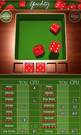 A traditional yahtzee(tm) like dice game, suitable for all ages. A game of Yachty Deluxe consists of 13 rounds. In each round, you roll the dice and score the result in one of 13 categories.You must score exactly once in each category, so skill and judgment are required as the game progresses and your options start to run out. The aim of the game is to make the biggest score you can from the 13 rounds.